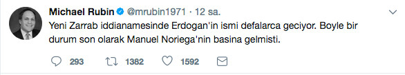 Twitter adresinden, ABD´de kara para aklama ve ABD´nin İran´a yönelik yaptırımlarını delme suçlamasıyla yargılanan Zarrab davasını hatırlatan Rubin, ?Yeni Zarrab iddianamesinde Erdoğan´ın ismi defalarca geçiyor? ifadelerini paylaştı.