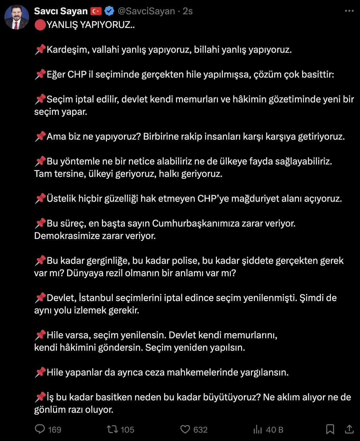AK Partili eski Ağrı Belediye Başkanı Savcı Sayan, CHP İstanbul İl Başkanlığı'na kayyım olarak atanan Gürsel Tekin'in il binasına girişinde yaşananlara tepki göstererek, "Kardeşim, vallahi yanlış yapıyoruz, billahi yanlış yapıyoruz. Ülkeyi geriyoruz, halkı geriyoruz. Bu süreç, en başta sayın Cumhurbaşkanımıza zarar veriyor. Demokrasimize zarar veriyor. Bu kadar gerginliğe, bu kadar polise, bu kadar şiddete gerçekten gerek var mı? Dünyaya rezil olmanın bir anlamı var mı?" dedi.