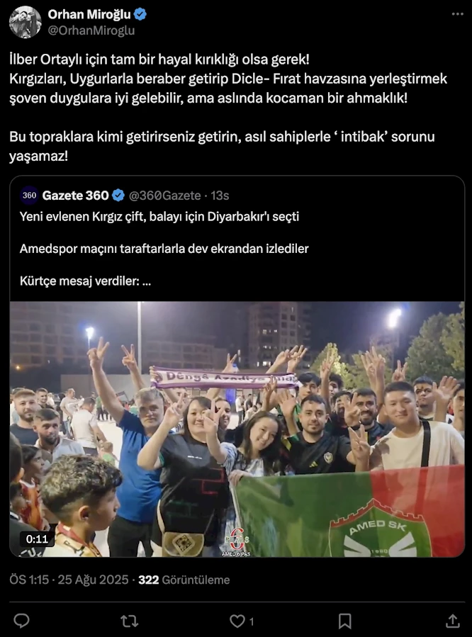 Sosyal medya hesabından balayı için Diyarbakır'ı seçen yeni evli Kırgız çiftin Kürtçe konuştuğu videoyu paylaşan Miroğlu, şunları yazdı:
