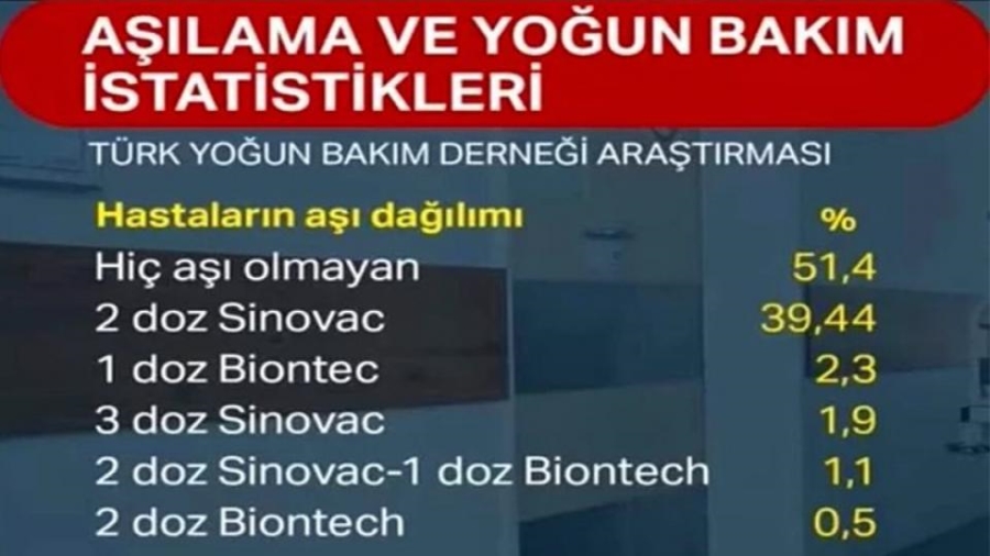 Türk Yoğun Bakım Derneği, Türkiye’deki 60 yoğun bakım ünitesinde 952 Covid-19 hastası ile ilgili aşı araştırması yaptı. Buna göre, yoğun bakımda yatan hastaların yüzde 51.4'ünün hiç aşı yaptırmadığı tespit edildi.