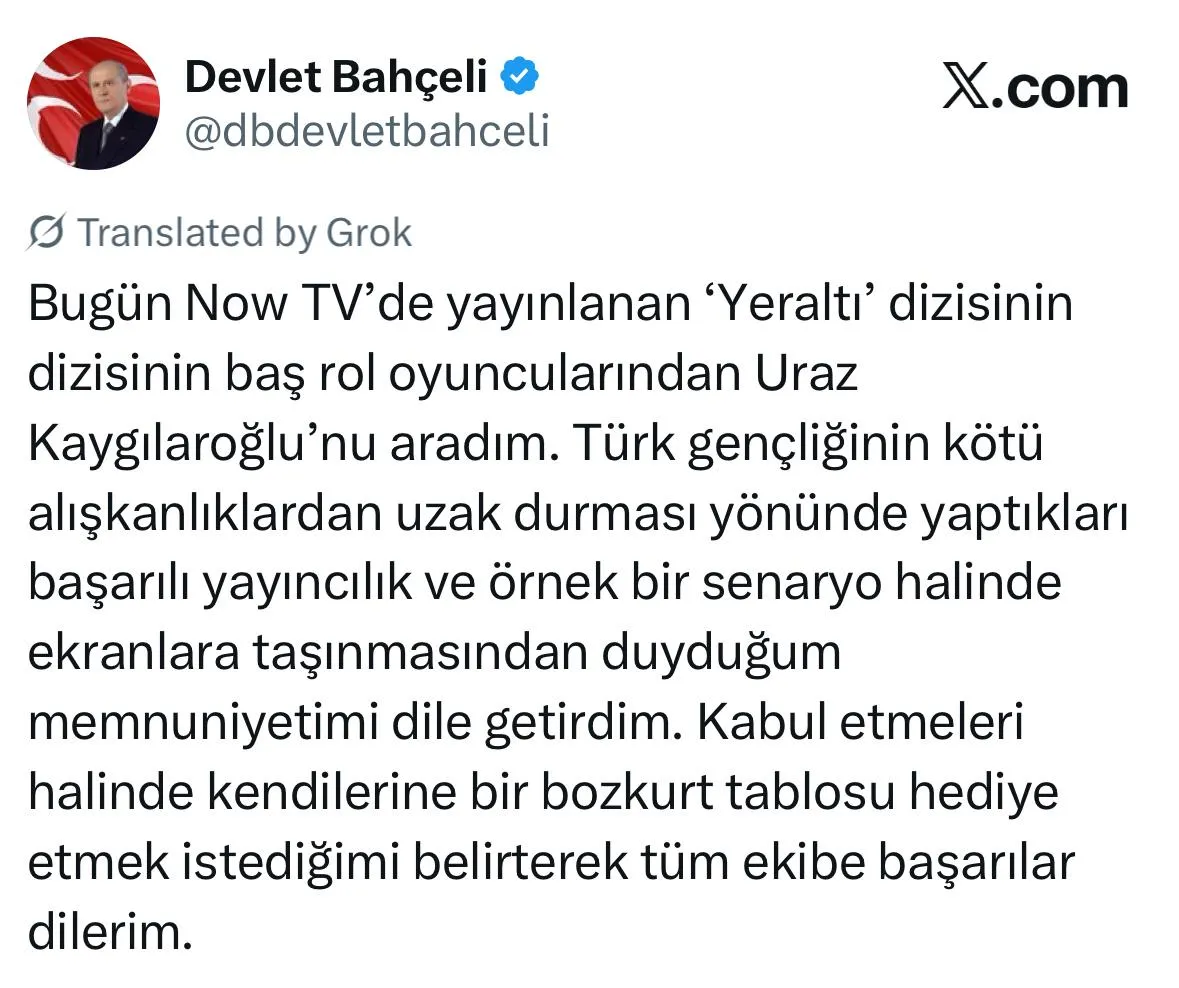 MHP Genel Başkanı Devlet Bahçeli, sosyal medya hesabından bir paylaşım yaparak NOW TV'de yayınlanan Yeraltı dizisinin başrol oyuncusu Uraz Kaygılaroğlu'nu arayarak tebrik ettiğini söyledi. Bahçeli, paylaşımında şu ifadeleri kullandı: