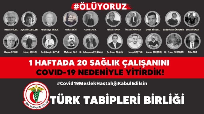 Türk Tabipleri Birliği (TTB), bir haftada 20 sağlık çalışanının koronavirüs nedeniyle hayatını kaybettiğini açıkladı. Açıklamada, ölen sağlık çalışanlarının fotoğrafları ile birlikte şu mesaj yayınlandı: