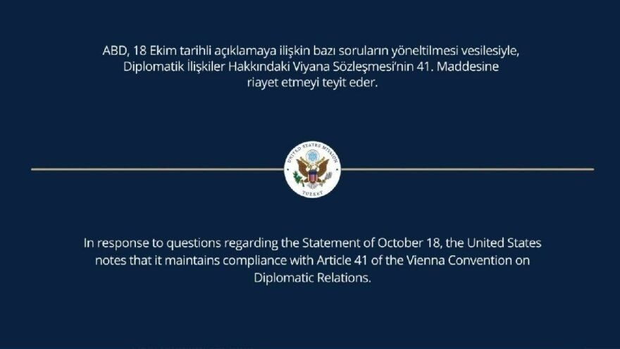 Açıklamada, “18 Ekim tarihli açıklamaya ilişkin bazı soruların yöneltilmesi vesilesiyle, Diplomatik İlişkiler Hakkındaki Viyana Sözleşmesi’nin 41’inci maddesine riayet etmeyi teyit eder” denildi.