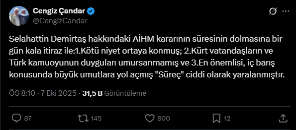 DEM Parti Diyarbakır Milletvekili Cengiz Çandar, Türkiye'nin sürenin dolmasına bir gün kala AİHM’in Selahattin Demirtaş kararına itiraz etmesine ilişkin değerlendirme yaptı. Çandar, MHP lideri Devlet Bahçeli'nin PKK lideri Abdullah Öcalan'a yaptığı çağrı sonrası başlayan, kamuoyunda "2. çözüm süreci" olarak adlandırılan sürece ilişkin olarak, "Selahattin Demirtaş hakkındaki AİHM kararının süresinin dolmasına bir gün kala itiraz ile:1.Kötü niyet ortaya konmuş; 2.Kürt vatandaşların ve Türk kamuoyunun duyguları umursanmamış ve 3.En önemlisi, iç barış konusunda büyük umutlara yol açmış "Süreç" ciddi olarak yaralanmıştır" dedi.