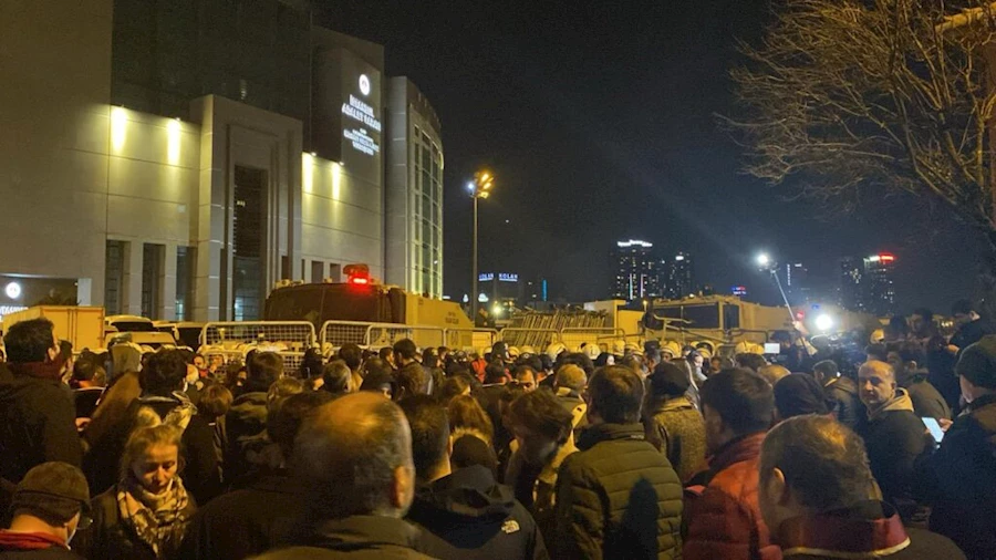İmamoğlu’nun Emniyet’teki ifadesinden sonra akşam saatlerinde İstanbul Adliyesi’ne getirilmesi üzerine binlerce kişi de Çağlayan’da toplandı.