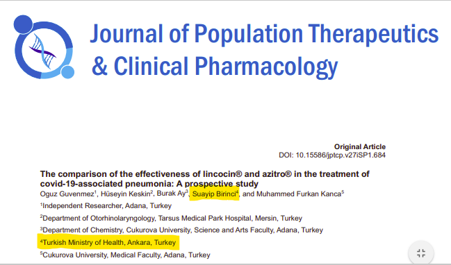 LINCOCIN® ve AZITRO® ismindeki ilaçların Covid-19 üzerindeki etkisinin karşılaştırıldığı çalışmada 5 Türkün imzası bulunuyor. İsimler arasında en dikkat çekeni, Sağlık Bakan Yardımcısı Şuayip Birinci oldu. Makalenin yazarları şöyle sıralanıyor: