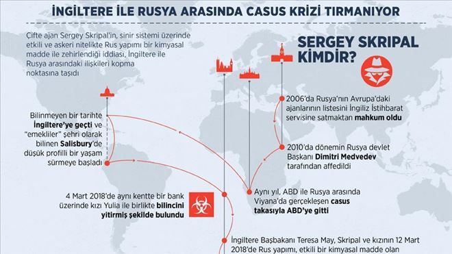 Çifte ajan Sergey Skripal ile kızı Yulia´nın sinir sistemi üzerinde etkili ve askeri nitelikte Rus yapımı bir kimyasal madde ile zehirlendiği iddiası, İngiltere ile Rusya arasındaki ilişkileri kopma noktasına getirdi.