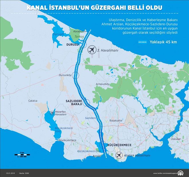 Ulaştırma, Denizcilik ve Haberleşme Bakanı Ahmet Arslan, Kanal İstanbul Projesi´ne ilişkin detayları anlattığı basın toplantısında proje güzergahının Küçükçekmece-Sazlıdere-Durusu koridoru olarak belirlendiğini açıkladı. Arslan, güzergahın yaklaşık 45 kilometre olduğunu da söyledi.