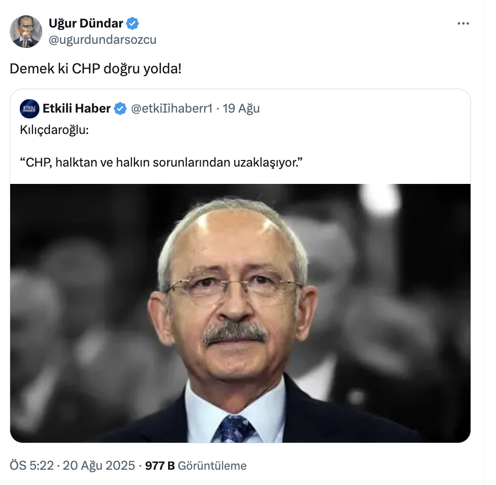Kılıçdaroğlu; kendisinin "CHP, halktan ve halkın sorunlarından uzaklaşıyor" dediğini iddia eden bir paylaşıma da "Demek ki CHP doğru yolda" yorumunu yapan Uğur Dündar'a da "gözünü kötülük bürümüş, ıslah olmaz muhteris" dedi.