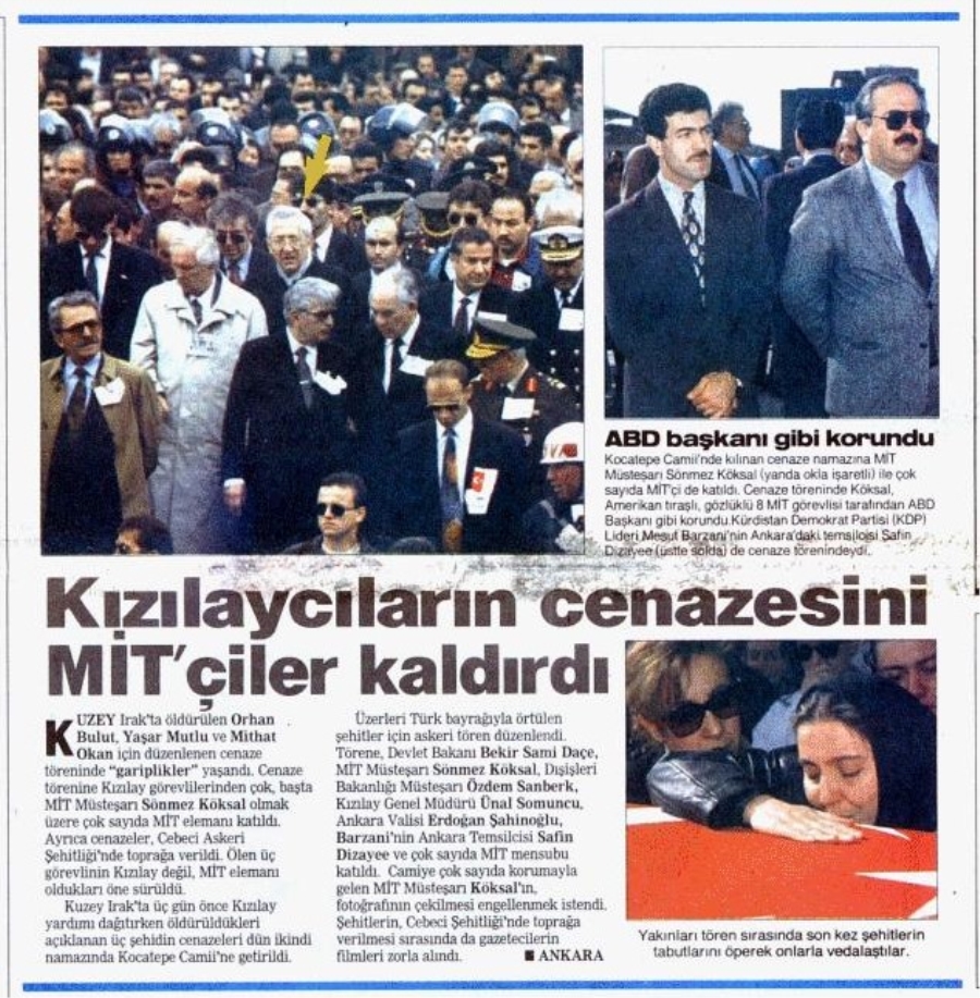 "Kuzey Irak'ta öldürülen Orhan Bulut, Yaşar Mutlu ve Mithat Okan için düzenlenen cenaze töreninde ‘gariplikler' yaşandı. Cenaze törenine kızılay görevlilerinden çok, başta MİT Müsteşarı Sönmez Köksal olmak üzere çok sayıda MİT elemanı katıldı.