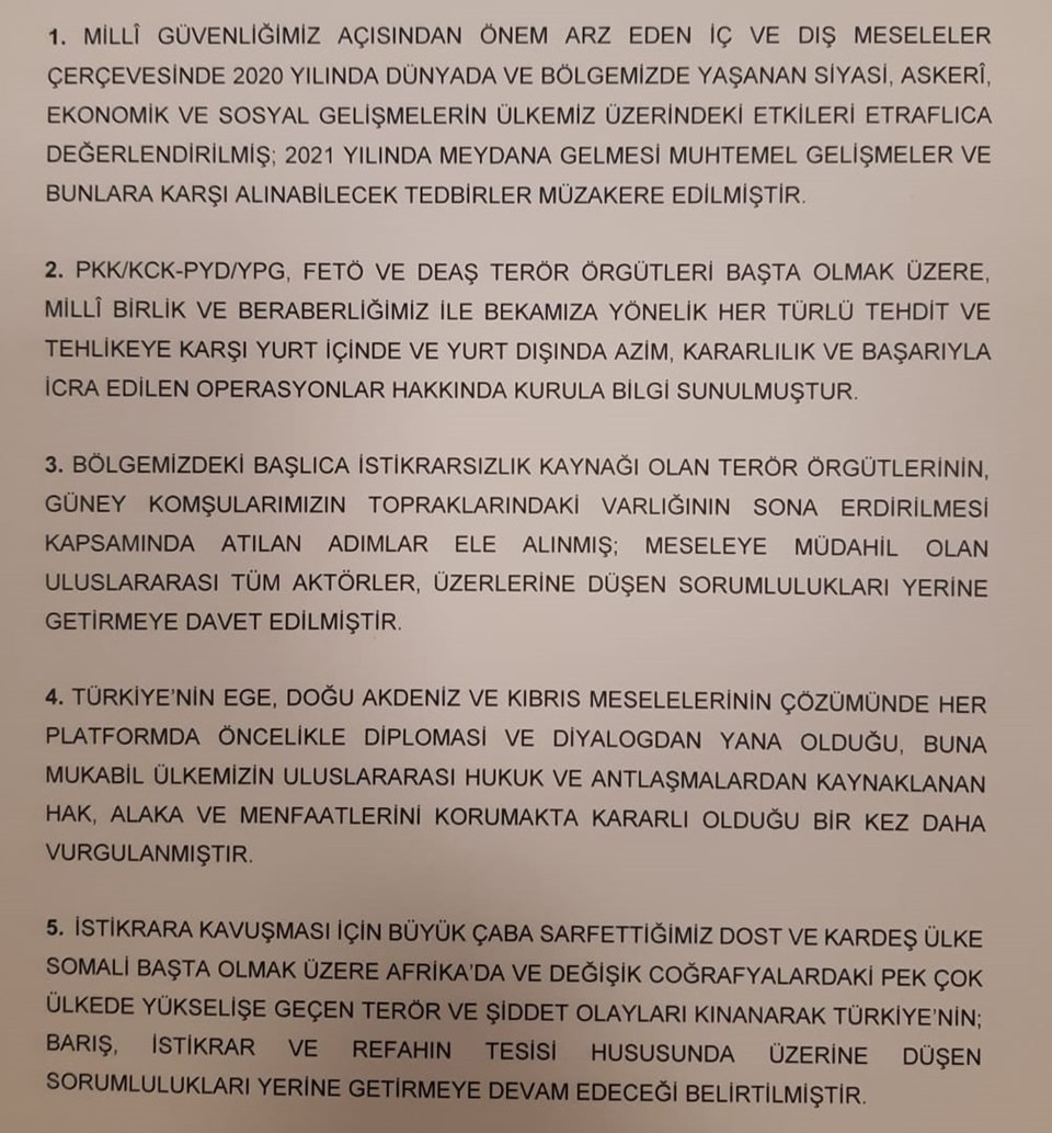 Cumhurbaşkanı Recep Tayyip Erdoğan, başkanlığında toplanan Milli Güvenlik Kurulu toplantısından sonra yazılı açıklama yapıldı;