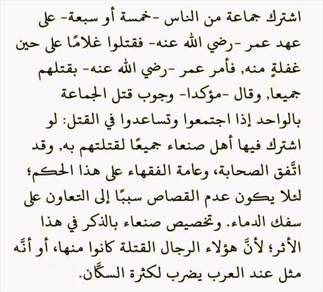 Hazreti Muhammed´in kısas konusunda yukarıda naklettiğim hadisinin Türkçesi, Diyanet´in yayınladığı ?Hadislerle İslâm? isimli eserin beşinci cildinin 489. sayfasında yazılıdır. San´alı kadının teşvik ettiği cinayet İbn Hacer´in ?Fethu´l-Bârî?sinde, Hazreti Ömer´in katiller hakkında söylediği ?Bu suça bütün San´a halkı iştirak etmiş olsaydı?? diye başlayan ifadesi de, İmam Mâlik´in sahih rivayetlerden derlediği hadisleri biraraya getirdiği meşhur ?El Muvattâ?ında geçer?
