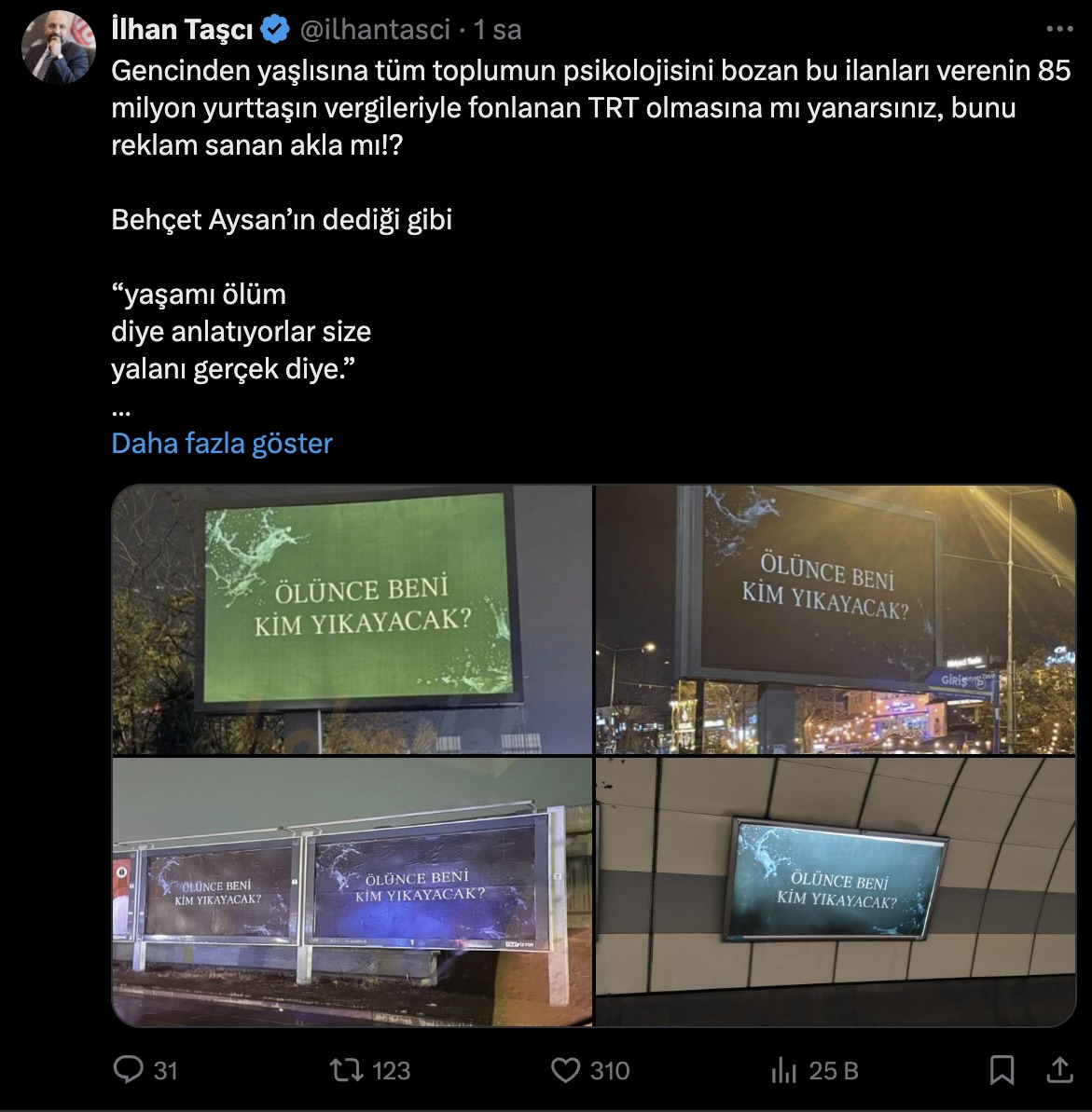Reklam panolarında yer alan ve sosyal medyada tepkilere neden olan "Ölünce beni kim yıkayacak?" afişlerinin sırrı ortaya çıktı. Afişlerin, TRT'nin uluslararası dijital platformu olan tabii'de yayınlanacak olan "Gassal" dizisine ait olduğu öğrenildi.