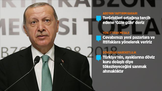 "Peki öyleyse kopan bunca fırtınanın sebebi nedir? Ekonomik hiçbir sebep yok. Peki bu işin bir adı var mıdır, vardır. Bunun adı Türkiye´ye operasyon çekmektir. Operasyonun amacı da ülkemiz ekonomisinin, savunma mekanizmalarını etkisiz hale getirerek, Türkiye´yi finanstan başlayıp siyasete kadar varan tüm alanlarda teslim almaktır. Türkiye´ye ve Türk milletine diz çöktürmektir. Trabzon´dan ilan ediyorum, oyununuzu gördük ve meydan okuyoruz. Şunu bilmelerini istiyorum, teslim olmayacağız, üretmeye devam edeceğiz. İhracatımızı artırmaya devam edeceğiz. İstihdamımızı genişletmeye devam edeceğiz. Fabrikalarımızın çarklarını işletmeye devam edeceğiz. Rekor büyüme oranlarıyla hedeflerimize yürümeye devam edeceğiz. Siz dolarla üzerimize gelirseniz, biz de başka yollarla işlerimizi yürütmenin çarelerini arayacağız." diye konuştu.