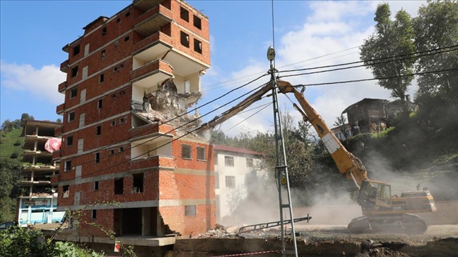 Rize´nin Muradiye beldesinde, şiddetli yağışların ardından gündeme gelen 7 katlı binanın yıkımına başlandı.