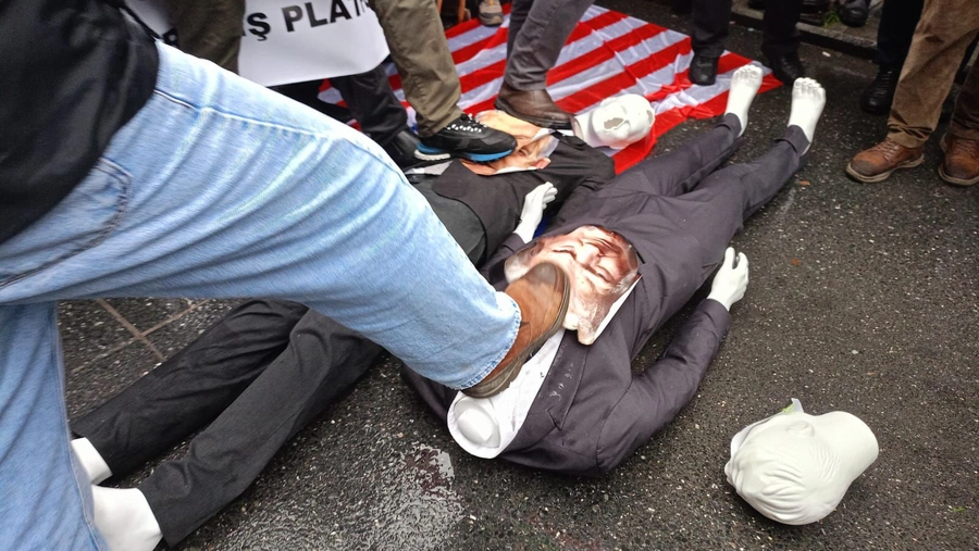 Basın açıklamasının ardından Donald Trump ve Binyamin Netanyahu’nun maketleriyle birlikte ABD ve İsrail bayrakları da yakıldı.