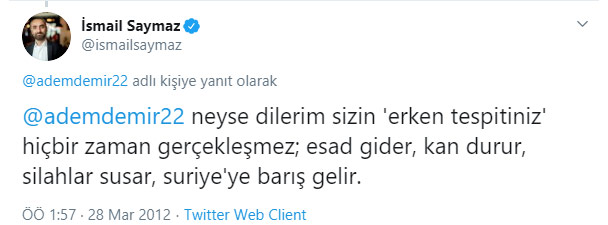 Bu çalışmada, Türk medyasında ön planda olan popüler isimlerin söylem değişikliklerine örnek teşkil etmesi için, Suriye savaşının başladığı dönemde sosyal medya platformlarında yaptıkları paylaşımların ekran görüntülerine yer verilmiştir.