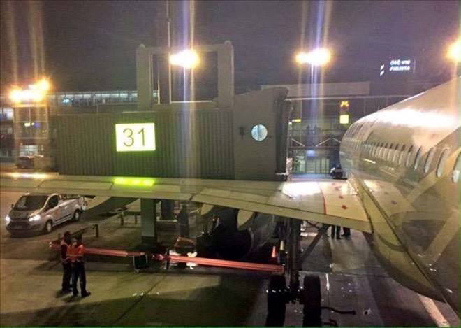 Türk Hava Yolları`nın İstanbul-Helsinki seferini yapan Airbus 320 tipi uçağı iniş yaptıktan sonra park pozisyonuna girerken, körüğe çarptı.