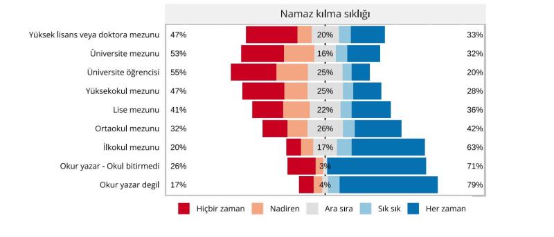 Türkiye'de yetişkin bireyler arasında sık sık ya da her zaman, yani düzenli olarak, beş vakit namaz kılanların oranı yüzde 39. Bu oran 65 ve üstü yaş grubunda yüzde 68'e çıkarken, 18-24 yaş grubunda yüzde 20'ye kadar azalıyor.