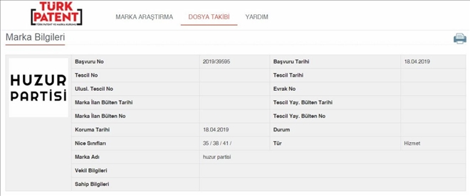 Huzur Partisi ile ilgili olarak ise 31 Mart Yerel Seçimleri sonrası 18 Nisan´da Türk Patent ve Marka Kurumu´na başvuru yapıldığı ortaya çıktı.