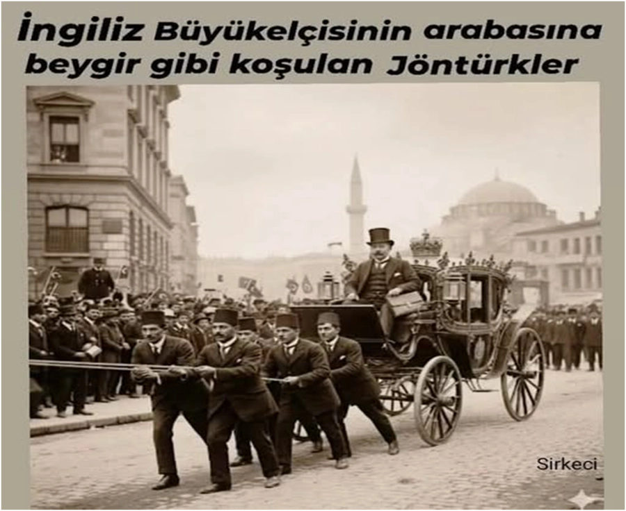 Bu hayranlığın en çarpıcı örneklerinden biri, 31 Temmuz 1908’de İngiltere’den İstanbul’a gelen büyükelçi Gerard Lowther’in arabasının Sirkeci Garı’ndan Jön Türkler tarafından kendi kollarıyla çekilmesidir. Jön Türkler olarak bilinen sivil İttihatçılar, büyükelçiyi coşkuyla karşılamış ve arabasının atlarını sökerek taşıma görevini bizzat üstlenmişlerdir. Ahmet İhsan Tokgöz’ün (Ahmet İhsan Tokgöz, Türk gazeteci, tercüman, matbaacı, yayımcı, siyasetçi ve spor yöneticisi. Türk matbuât tarihinin en uzun süreli dergilerinden olan Servet-i Fünûn'un kurucusudur. 1868-1942) hatıralarında aktardığı gibi, bu olay sadece bir gösteri değil, İttihatçı aydınların İngilizlere duyduğu hayranlığın ve siyasi tecrübesizliklerinin bir tezahürüdür. İngiliz büyükelçi Lowther, bu şaşkınlığı Londra’ya çektiği telgrafta, gençleri “politik tecrübeden yoksun, aralarında birlik bulunmayan iyi niyetli çocuklar topluluğu” olarak tanımlamıştır. Bu ifade, aslında İttihatçıların İngilizler karşısındaki duruşunu en yalın biçimde ortaya koyar: Batı’nın siyasal modellerini kendi tarihî birikimlerinden daha değerli gören bir zihniyet.