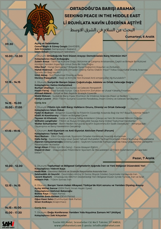 6-7 Aralık günleri, İstanbul’da, Ortadoğu’da Barışı Aramak konulu uluslararası bir toplantı düzenlendi. Bu toplantı, yıllar önce bölgedeki toplumları birbirine yakınlaştırmak ve aralarındaki meseleleri müzakereler yoluyla çözerek barışa bir yol açmak için başlatılmış olan Doğu-Batı konferansını yeniden canlandırmak için bir girişimdi. Toplantıya Arap ülkeleri, İran ve Avrupa ülkelerinden katılan davetlilerle özellikle Suriye ve Filistin meselesi ve Siyonizm sorunu, İran Devrimi, Barış Süreci gibi bölgesel meseleler yanında toplumsal sorunların çözümünde şiddetin kullanımı ve barışçı yollar, demokratikleşme gibi meseleler tartışıldı. Oldukça ilgi gören bu girişim umulur ki yeni bir toplumsal ve siyasal yönelimin de başlangıcını oluşturur.